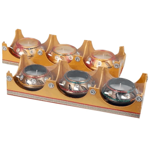 Pack of 3 designers handcrafted wax diyas with assorted designs which last about 45 Min Approximately. It is ideal for decoration, lightning, festival, spiritual, Vastu etc. These candles encased in a thin metal cup so that the candle can liquefy completely while lit. They are typically small, circular, wider than their height and inexpensive. Because of their small size and low level of light, multiple tea lights are often burned simultaneously. Their use in teapot warmers, but are also used as food warmers in general, they are also suitable for accent lighting and for heating scented oil.