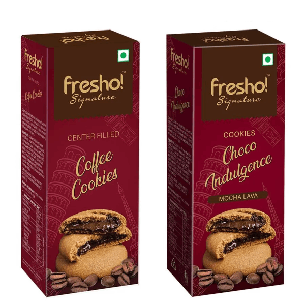 • Fresho Signature brings you rich, dark and crunchy chocolate cookies filled with molten, gooey chocolate and coffee creme, baked to perfection.