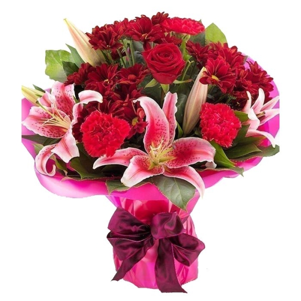 Bunch of roses, lilies and mixed seasonal flowers in warm colors, decorated with greenery. Conveys love, joy and happiness. Suitable for occasions like births, love, congratulations, birthdays, weddings, anniversaries and inaugurations.